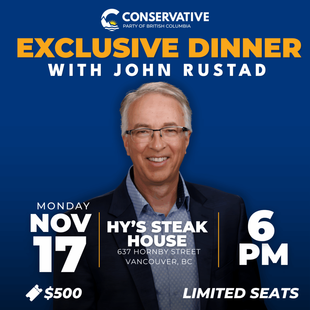 Join us for an intimate evening with John Rustad, Leader of the Conservative Party of British Columbia. This exclusive dinner offers guests a unique opportunity to share a meal, engage in meaningful conversation, and hear directly from John about his vision for restoring common sense and prosperity to our province.